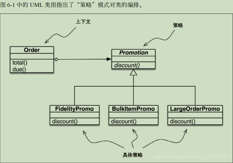 上下文: 把一些计算委托给实现不同算法的可互换组件,它提供服务。在这个电商示例中,上下文是 Order,它会根据不同的算法计算促销折扣。